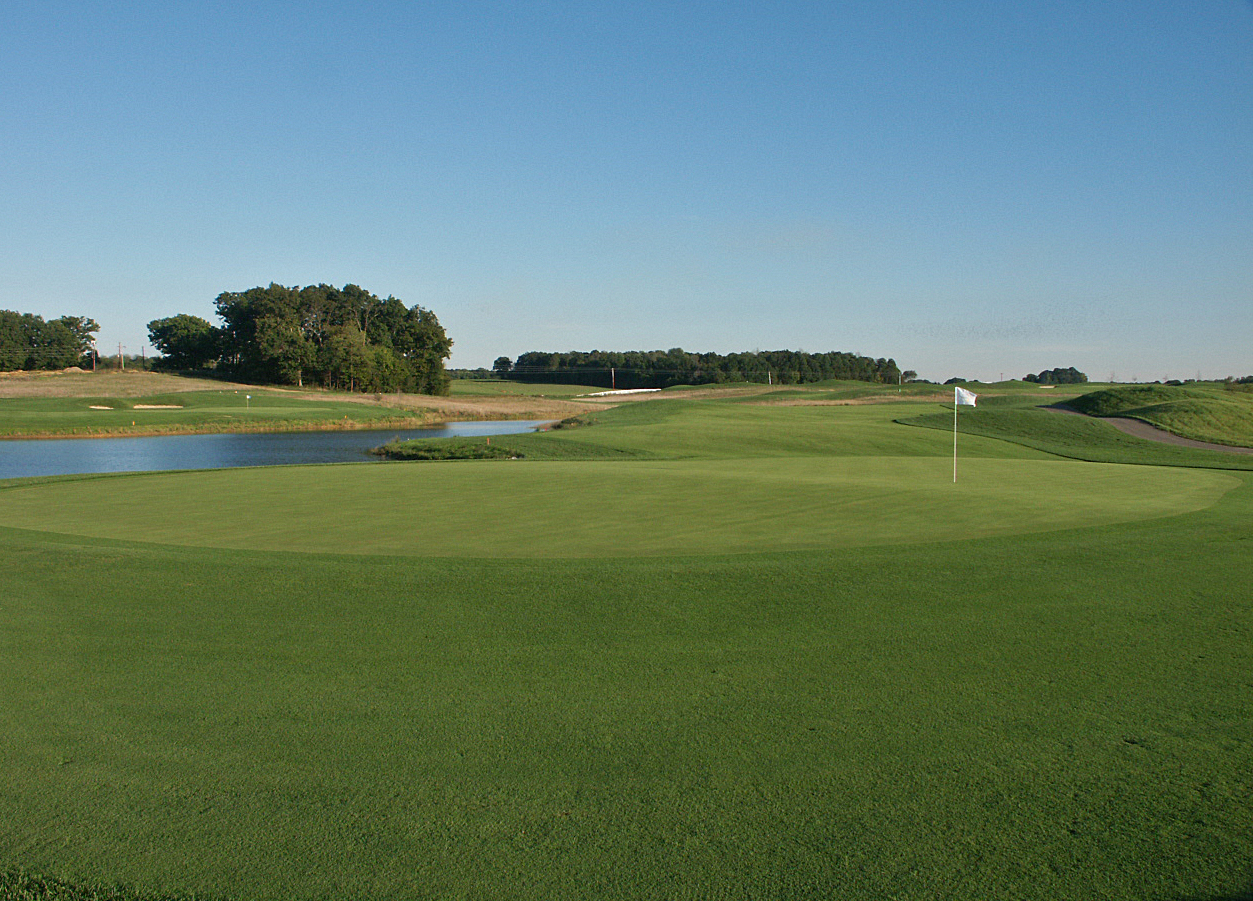 Playing downhill to a putting surface that is well connected to the adjacent pond, the par three third is a perfect example of our blending of maintained bentgrass amongst a sea of natural fescue areas. The bunkerless green complex angles from right to left and away from the player, making club selection vary distinctly based on hole location.