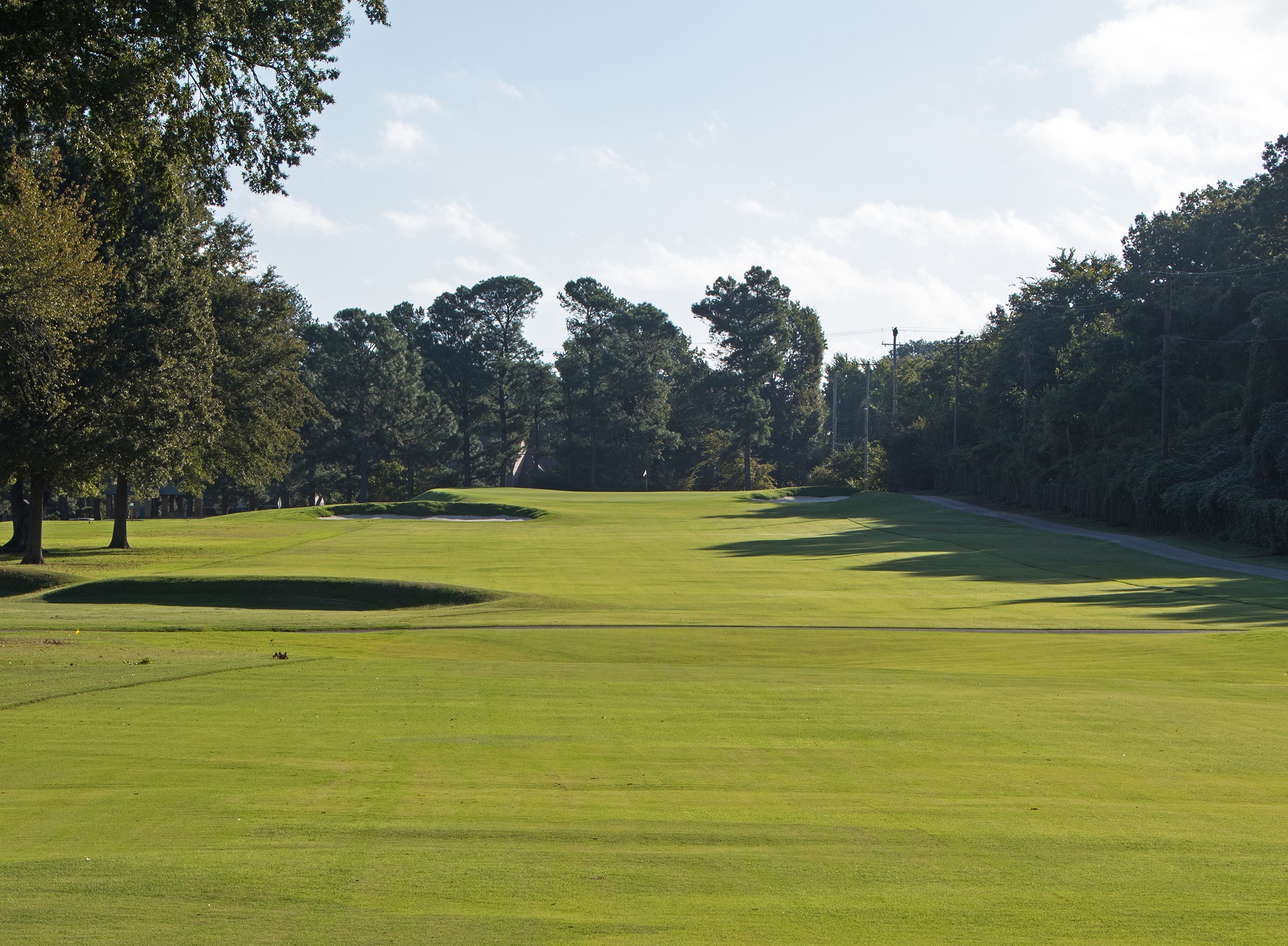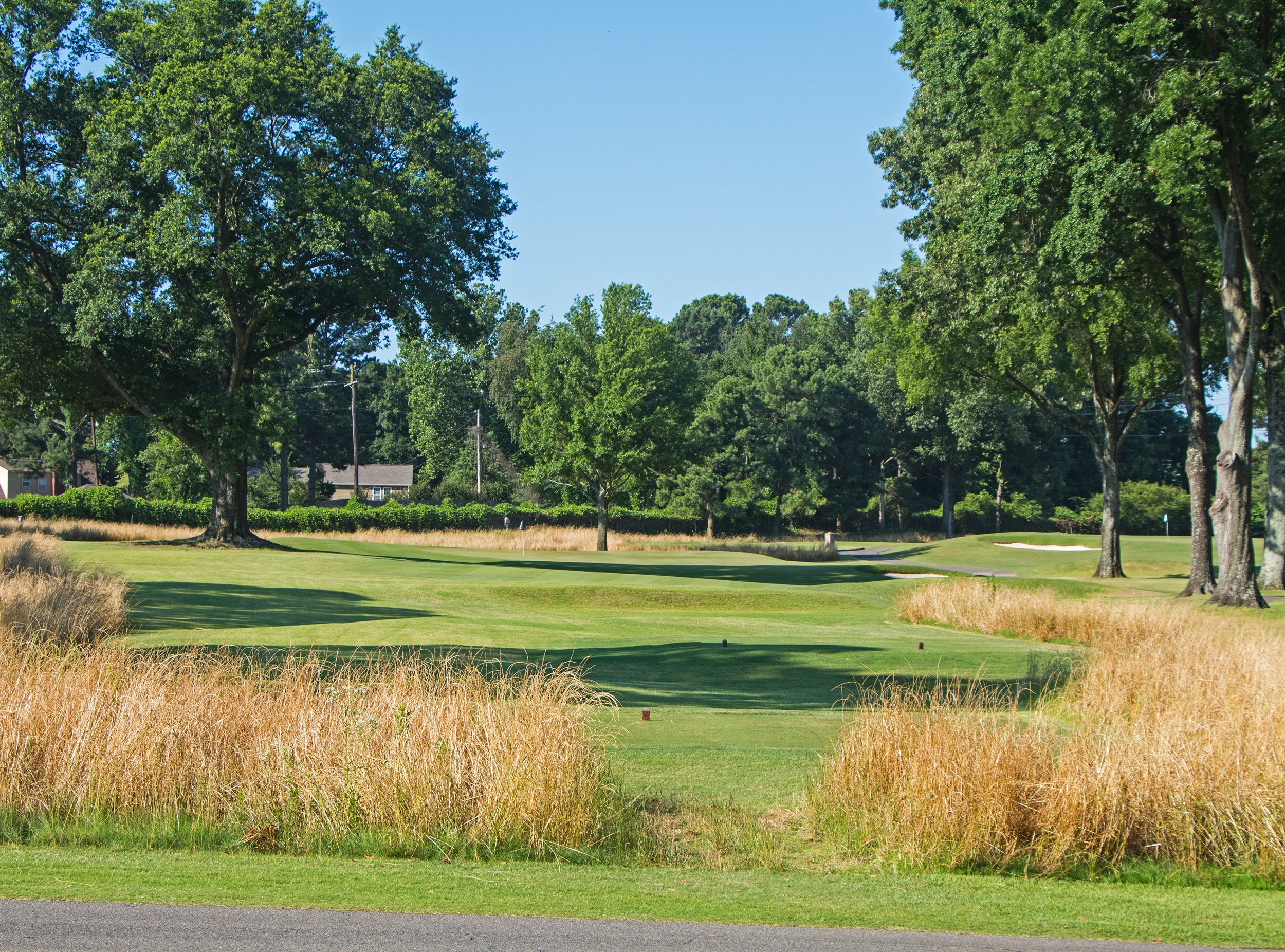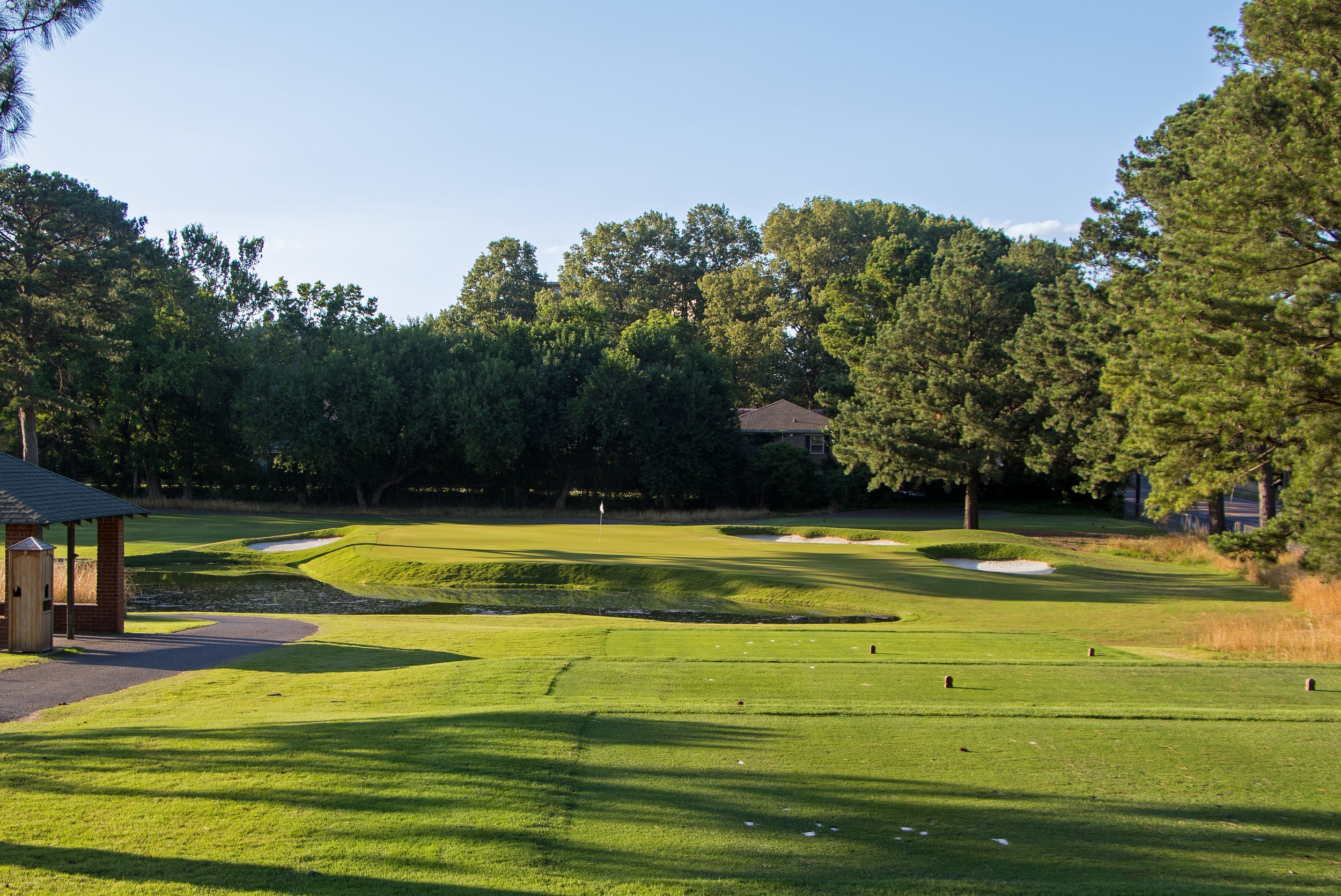 Lined on both sides of the fairway with large hardwoods, the tee ball must be shaped slightly left to right to stay in the canted away fairway on the par five 4th hole. Once in position, a carry over the cross bunker leaves a perfect chip onto the putting surface.