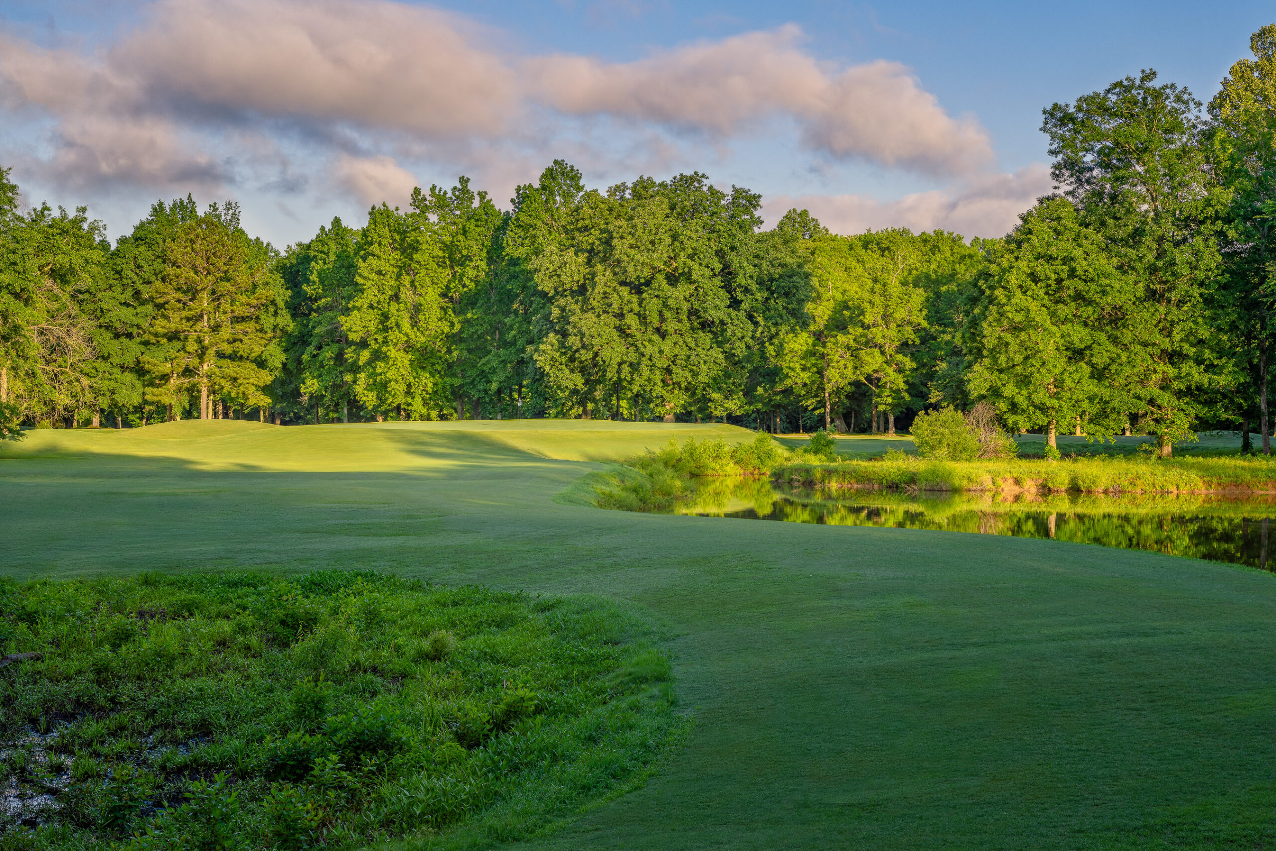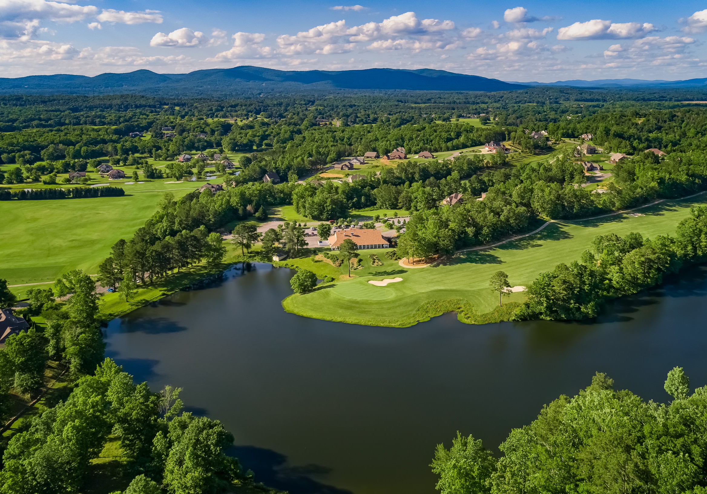 From its elevated landing zone, the approach to the long par four 14th hole may be the most scenic on the course. Right of the green is a beautifully exposed rock outcropping and the Little Hillabee Creek that feeds the waterfall on the 12th hole.