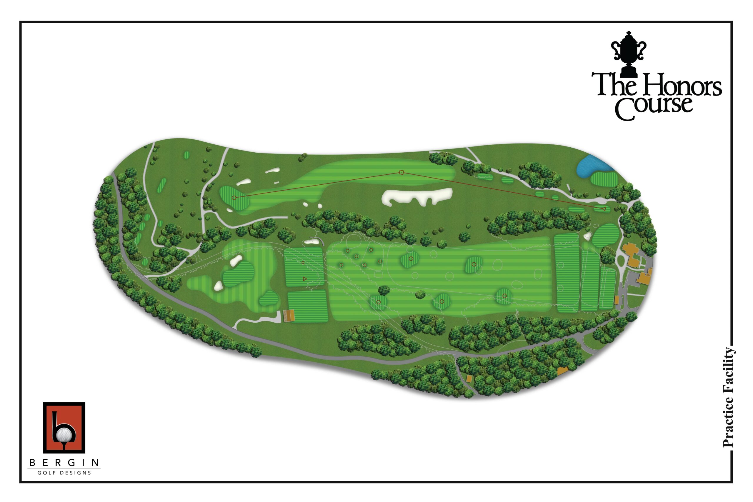 The attached rendering shows the extent of the practice area found at The Honors Course. With about 90,000 square feet of tee space on a variety of grass types, conditions are always excellent. The far end features a large short game area green and a smaller “putting only” green. Practicers can recreate just about any scenario they might face when playing the golf course. The club entrance road was relocated to make room for this facility.