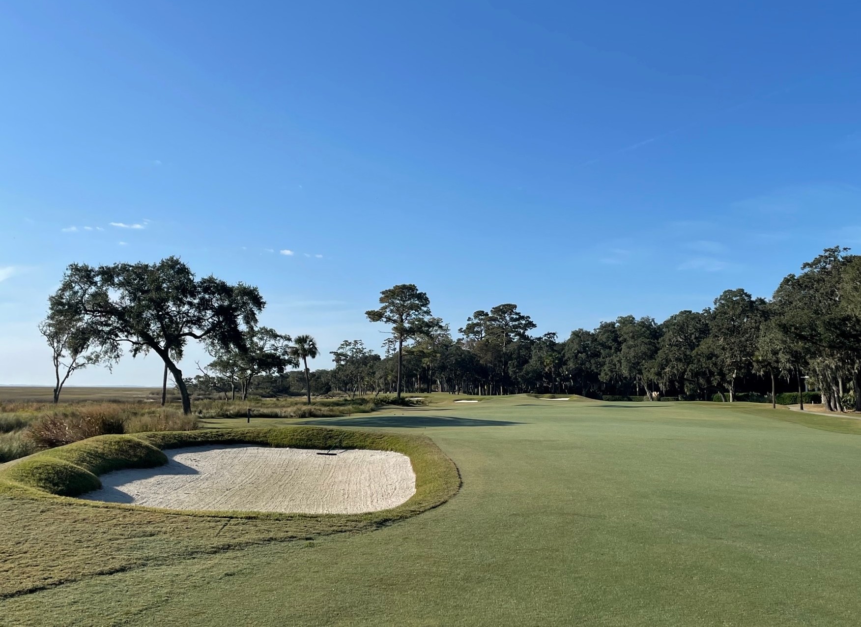 It’s easy to be distracted playing this beautiful par three jutting out into the marsh. Typically, the wind blows, creating havoc and guess work with club selection. The green is shallow and slightly raised, demanding accuracy and distance control.
