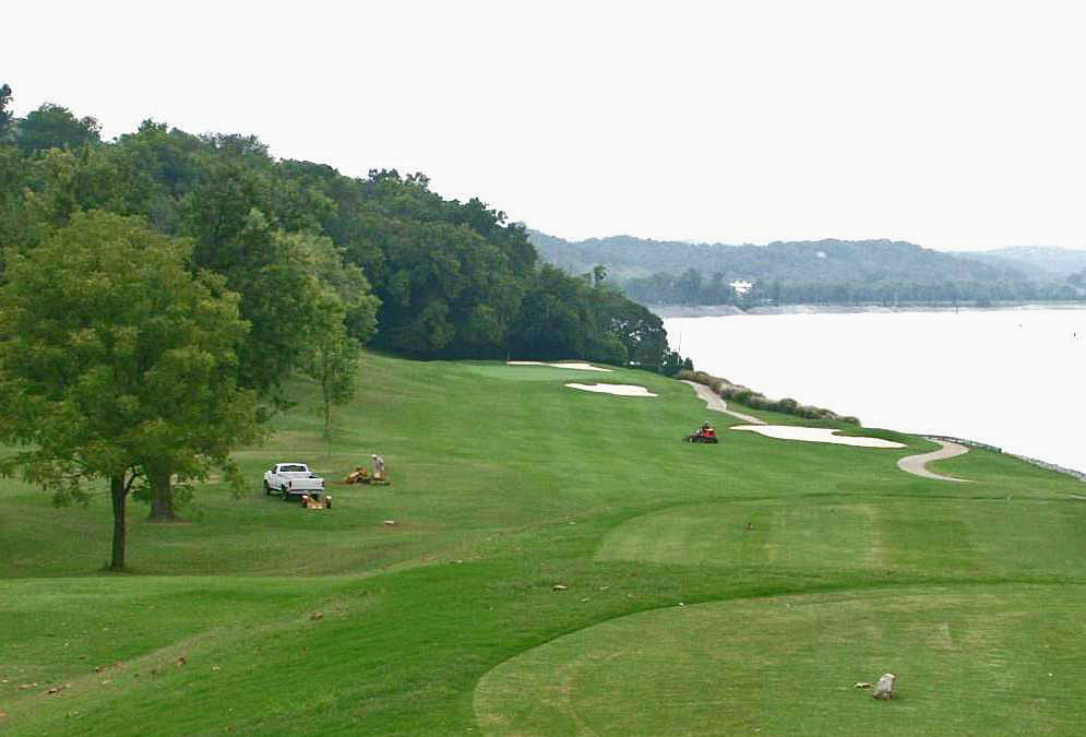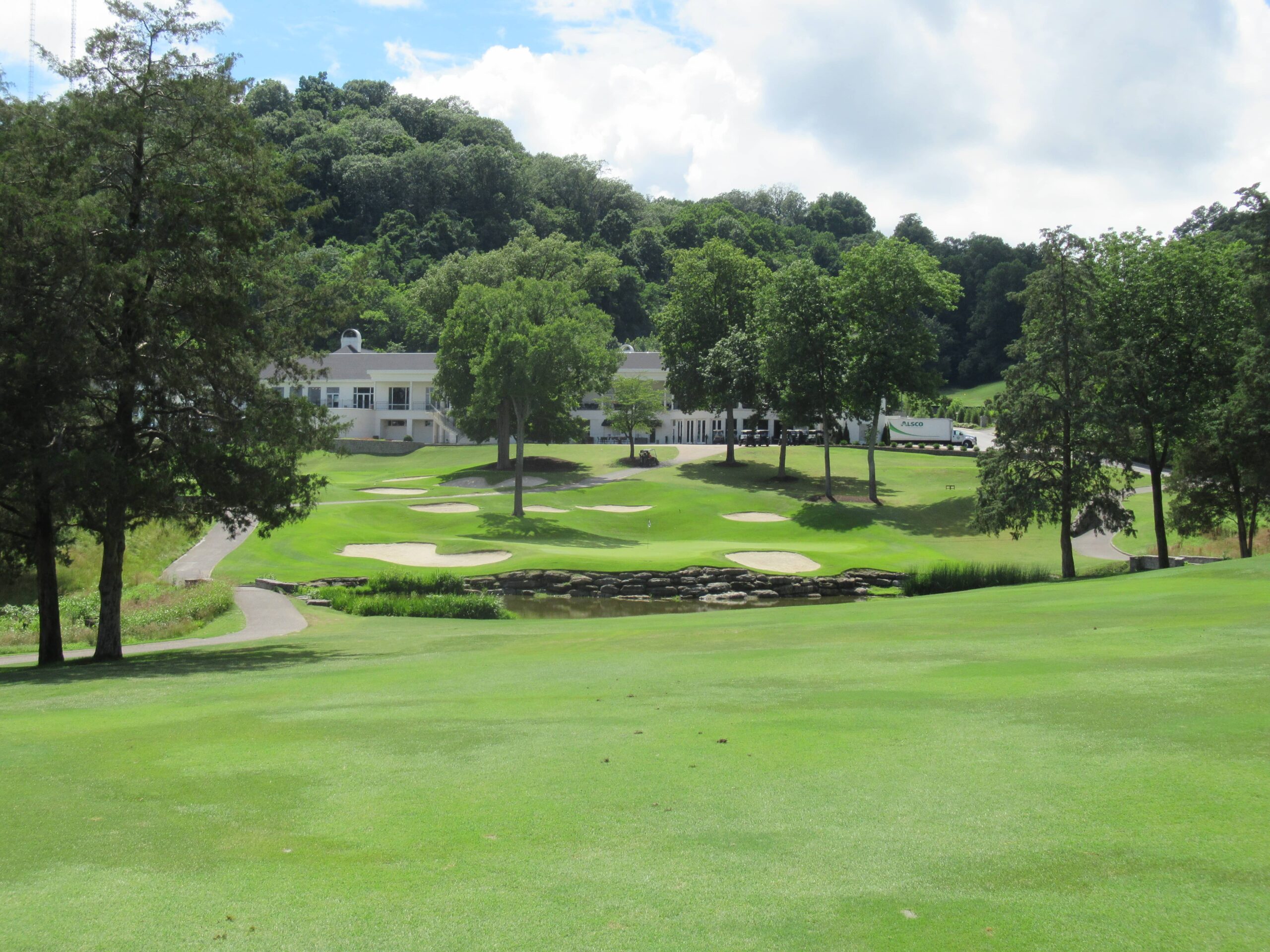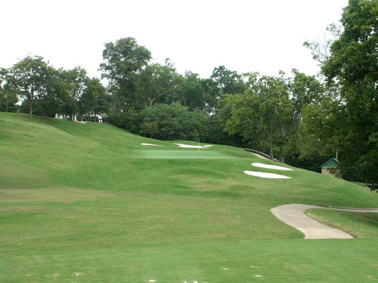 Playing on a bluff along the Tennessee River, the 9th at Chattanooga brings high tension to the close of the front nine. Additional hole locations and shaping to keep balls from simply bounding off the left slope have combined for a dramatic par three.