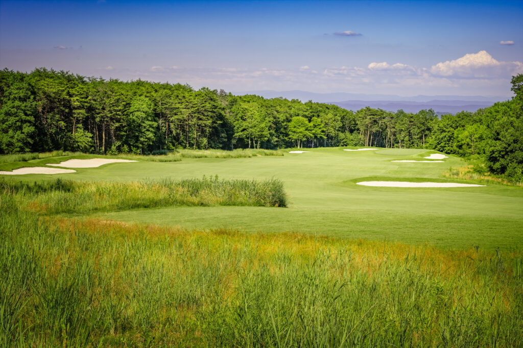 Bold bunkering shows off the gradual rise of the 6th fairway. This is truly a par four and a half, but it’s shallow green sits just past the center bunker and requires proper distance control to hold the putting surface.